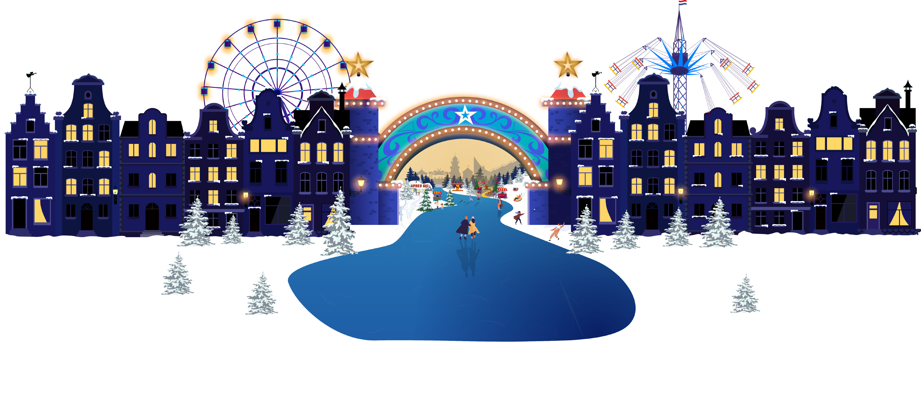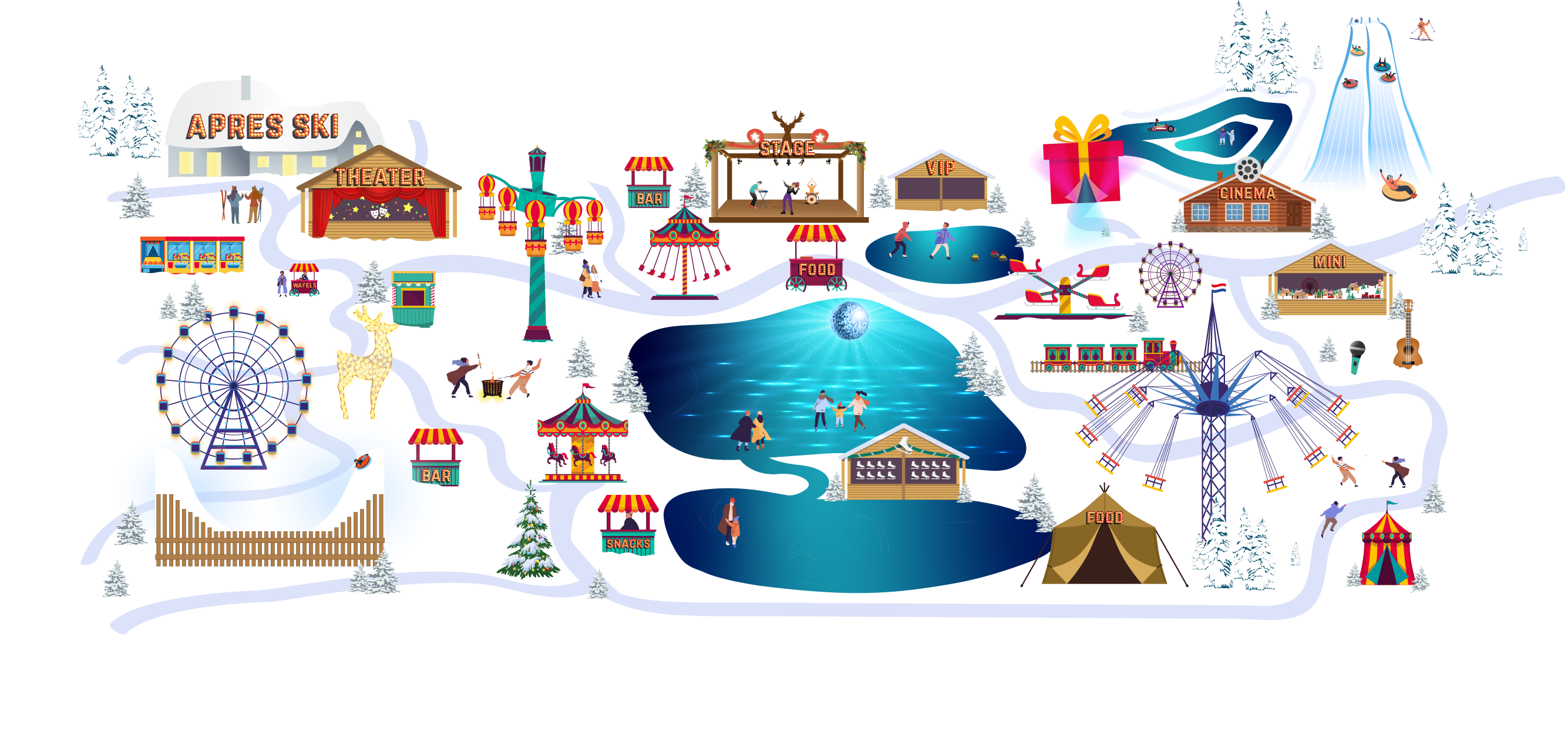 Hieronder vind je de plattegrond van Het Amsterdamse Winterparadijs. Klik op één van de attracties op de plattegrond en check de openingstijden, het programma en meer informatie.