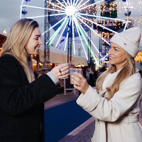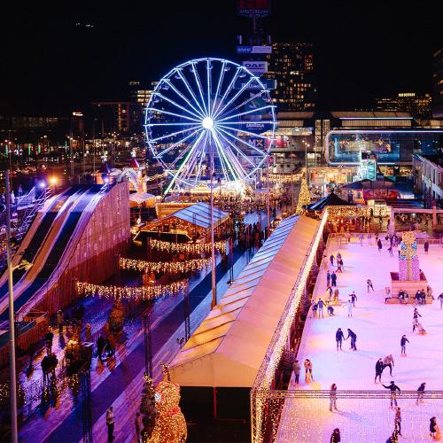 Glij over onze buiten schaatsbaan omringd door sprankelende lichtjes en het feestelijke Winterplein.