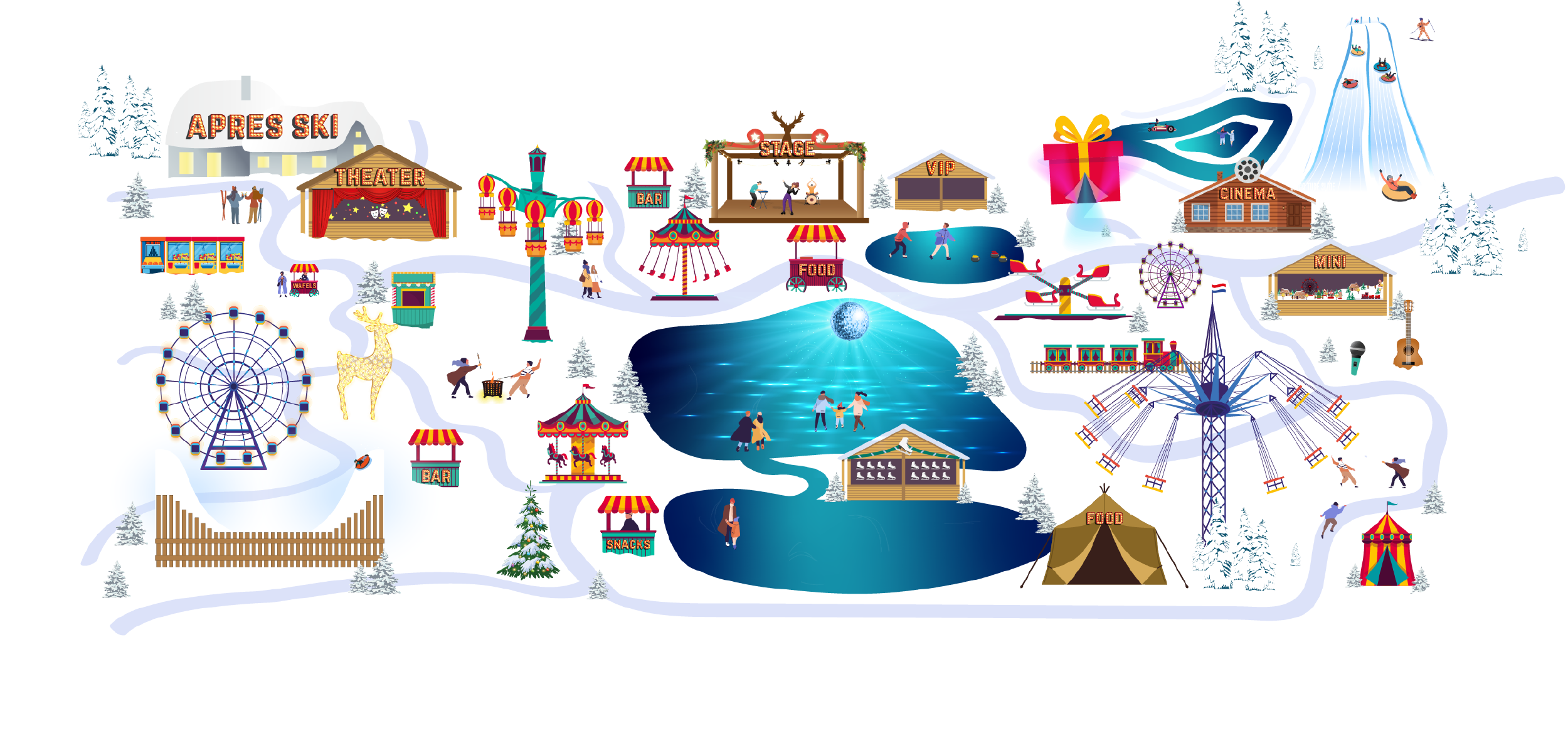 Hieronder vind je de plattegrond van Het Amsterdamse Winterparadijs. Klik op één van de attracties op de plattegrond en check de openingstijden, het programma en meer informatie.