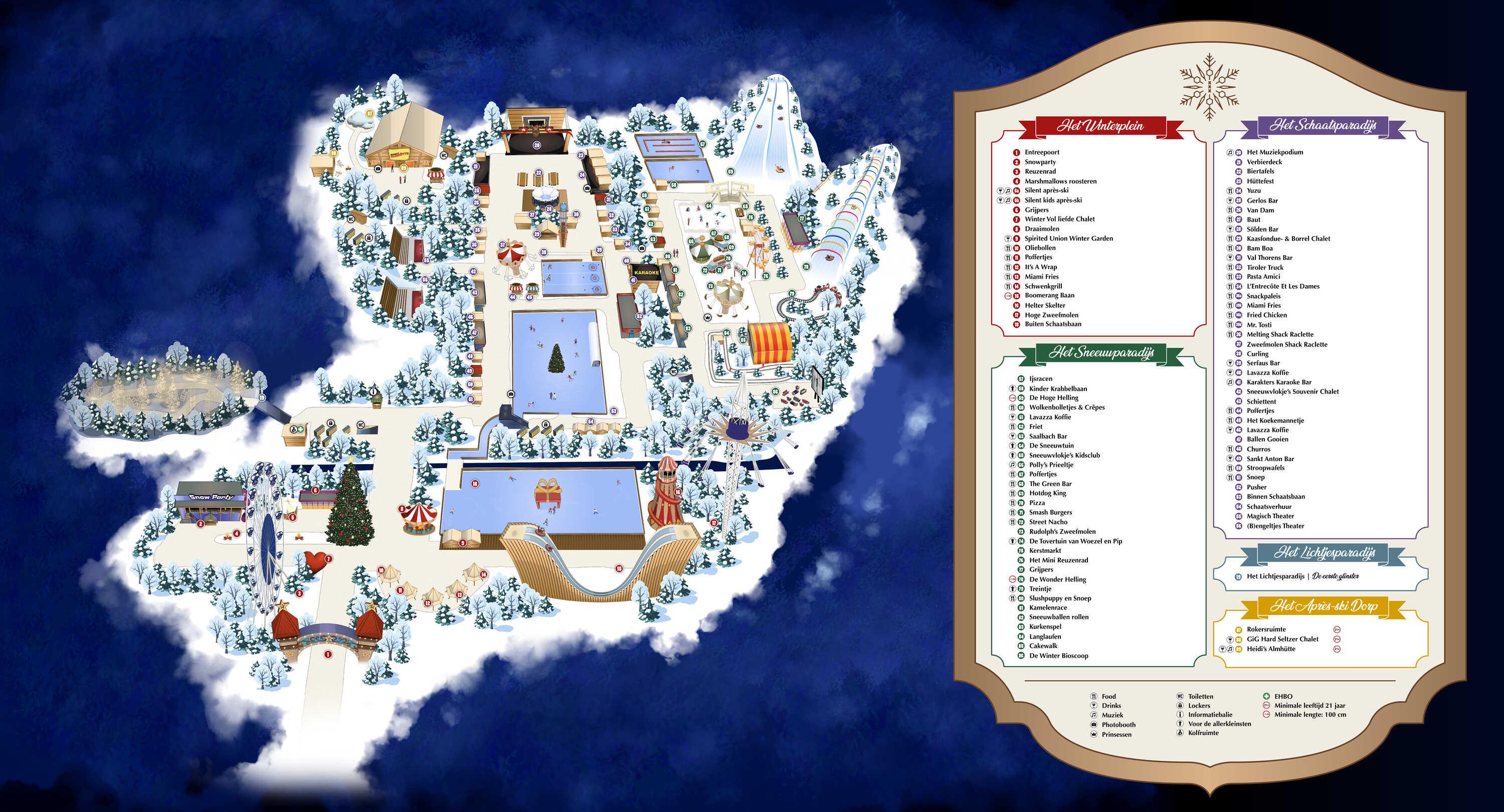Hieronder vind je de plattegrond van Het Amsterdamse Winterparadijs en een legenda zodat je precies kunt vinden wat je zoekt.